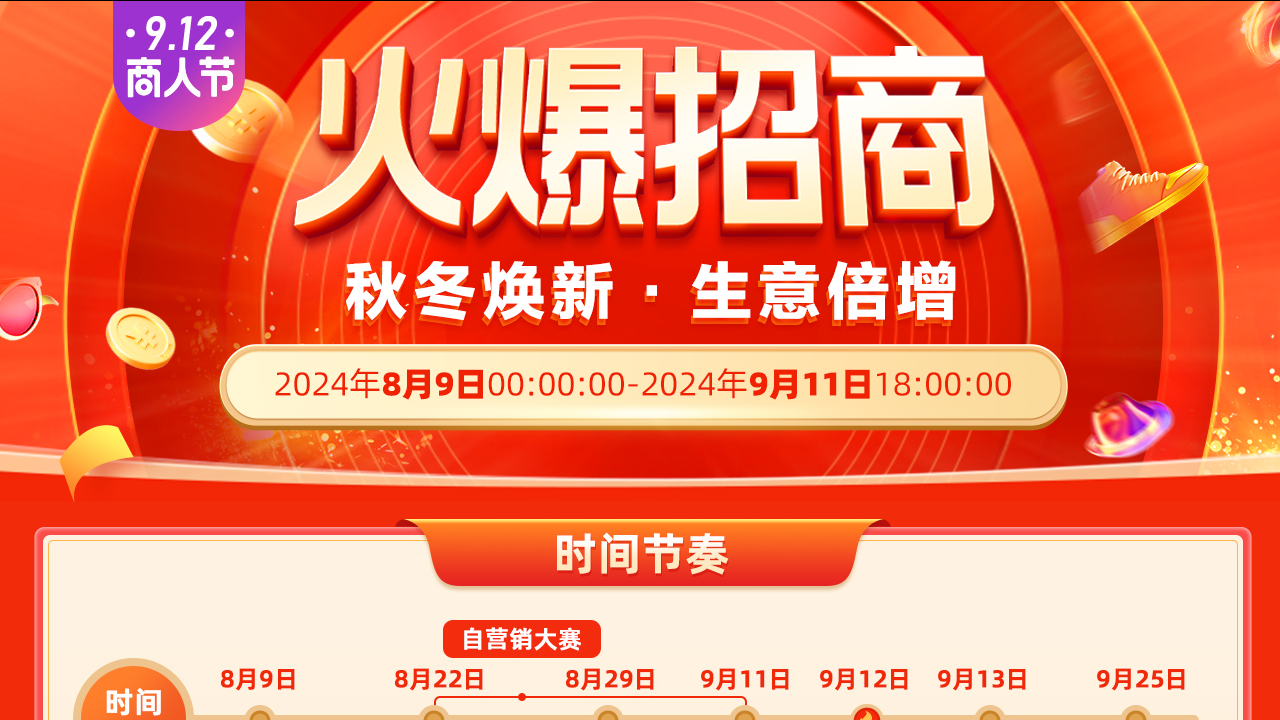 9.12商人節(jié)活動節(jié)奏怎樣?本次活動的優(yōu)惠疊加邏輯是什么?為什么滿足了招商要求,還提示報名不成功?......一文幫您快速解答這些問題,了解“9.12商人節(jié)”全流程!